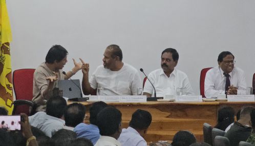 இதன்போது நாடாளுமன்ற உறுப்பினர் கஜேந்திரகுமார் பொன்னம்பலம் கருத்து தெரிவிக்க முயற்சித்தவேளை அவரை கருத்து தெரிவிக்க விடாமல் அருச்சுனா குழப்பினார். இதன்போது கஜேந்திரகுமார் பொன்னம்பலம் அருச்சுனாவில் ஒலிவாங்கியை நிறுத்தினார். இருந்தும் அவர் கூச்சலிட்டு குழப்பியதால் குறித்த விடயத்தை அம்பலப்படுத்தினார்.