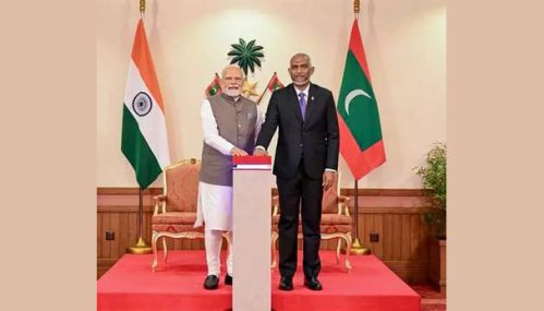 பிரதமர் மோடியின் வருகையையொட்டி நேற்று நடைபெற்ற அரசு விருந்தின்போது, மாலத்தீவுக்கு இந்திய அரசு அளித்து வரும் தொடர்ச்சியான ஆதரவு மற்றும் உறுதியான நட்புக்கு நன்றி தெரிவிப்பதாக முகமது முய்சு கூறினார். தொடர்ந்து அவர் பேசியதாவது; “மாலத்தீவு மற்றும் இந்தியா இடையேயான நீண்டகால உறவுகளுக்கு இந்தியப் பெருங்கடல் ஒரு உயிருள்ள சான்றாகும். இரு நாடுகளும் ராஜதந்திரத்திற்கு அப்பாற்பட்ட ஒரு நெகிழ்ச்சியான மற்றும் உடைக்க முடியாத உறுதியான பிணைப்பு உள்ளது. அனைவரையும் உள்ளடக்கிய மற்றும் துடிப்பான பொருளாதாரத்தை கட்டியெழுப்புவதற்கும், இளைஞர்களை மேம்படுத்துவதற்கும், பிராந்தியத்தில் அமைதி மற்றும் பாதுகாப்பை உறுதி செய்வதற்கும் மாலத்தீவு அரசாங்கம் உறுதிபூண்டுள்ளது. இந்த லட்சியங்களை நனவாக்குவதில் இந்தியாவின் கூட்டாண்மை முக்கிய பங்கு வகிக்கிறது.” இவ்வாறு முகமது முய்சு தெரிவித்துள்ளார்.