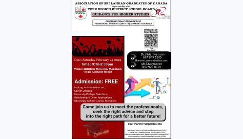 ஒன்றாரியோ மாகாணத்தில் வாழும் தமிழ் பேசும் மாணவர்கள் தங்கள் உயர் கல்வியை எவ்வாறு தொடர்வது என்பது பற்றிய பயனுள்ள கருத்தரங்கு நடைபெறுகின்றது. கனடா வாழ் இலங்கை பட்டதாரிகள் சங்கத்தின் ஏற்பாட்டில் இந்தக் கருத்தரங்கு நடைபெறுகின்றது என்பது குறிப்பிடத்தக்கது.