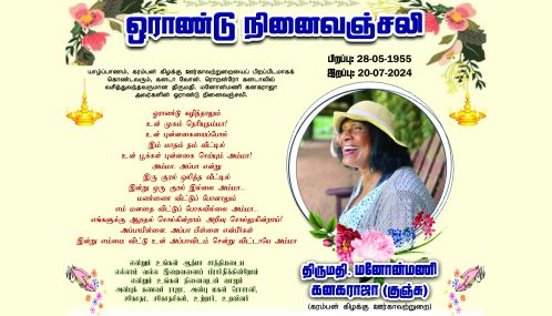யாழ்ப்பாணம், கரம்பன் கிழக்கு ஊர்காவற்றுறையைப் பிறப்பிடமாகக் கொண்டவரும், கனடா வோன். ரொறன்ரோ கனடாவில் வசித்துவந்தவருமான திருமதி. மனோன்மணி கனகராஜா அவர்களின் ஓராண்டு நினைவஞ்சலி.