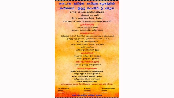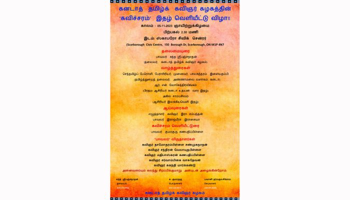 கனடா அரசியல் கனடாவில் தமிழ்க் கவிஞர் கழகத்தின் ‘கவிச்சரம்’ இதழ் வெளியீட்டு விழா Sam Daniel October 26, 2023 Share கனடாத் தமிழ்க் கவிஞர் கழகம் தனது கவிச்சரம் இதழை எதிர்வரும் 2023-11-05 ஆம் திகதி ஞாயிற்றுக்கிழமை வெளியிடவுள்ளது.