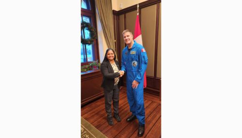 கனடிய விண்வெளி வீரர் ஜெர்மி ஹேன்சன் அவர்களை பாராளுமன்ற வளாகத்தில் சந்தித்து வாழ்த்துத் தெரிவித்த தமிழ் பேசும் கனடிய பாராளுமன்ற உறுப்பினர் யுனிற்றா நாதன் அவர்கள்