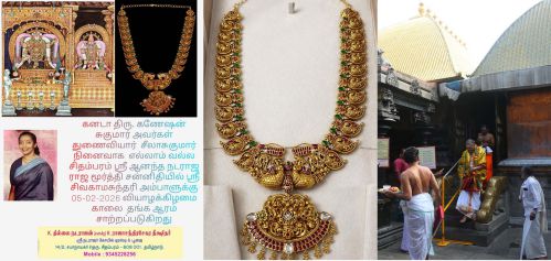 உலகப் புகழ்பெற்ற சிதம்பரம்: Shri Chidambaram Natarajar Temple பொற்சபையில் ஸ்ரீ நடராஜருடன் இருக்கும் ஸ்ரீ சிவகாம சுந்தரி அம்மனுக்கு கனடாவைச் சேர்ந்த திரு. கணேசன் சுகுமார் 5ம் திகதி வியாழக்கிழமை அன்று 108 கிராம் எடையுள்ள தங்க ஆரத்தை பக்தியுடன் காணிக்கையாக வழங்கினார்.