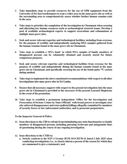 விசாரணைகளை நடத்தும்போது (அதாவது, ஒரு நபர் வாக்குமூலம் அளிக்க ஏன் அழைக்கப்படுகிறார் என்பதை தெளிவாகத் தெரிவிப்பதற்காக) ஜூலை 2, 2025 திகதியிடப்பட்ட பொலிஸ்மா அதிபரின் RTM 101/CRTM 61 இலக்க சுற்றறிக்கைக்கு அமைய செயல்படுமாறும், குறித்த தவறுகள் தொடர்பிலான தெளிவான சந்தேகம் காணப்படுகின்ற சந்தர்ப்பங்களைத் தவிர, செம்மணி புதைகுழி விசாரணை குறித்து செய்தி வெளியிடும் ஊடவியலாளர்களை அழைத்து புலனாய்வு அதிகாரங்களை துஷ்பிரயோகம் செய்வதைத் தவிர்க்குமாறு பயங்கரவாத எதிர்ப்பு மற்றும் விசாரைணைப் பிரிவுக்கு (CTID) அறிவுறுத்தல்களை வழங்குமாறும் இலங்கை மனித உரிமைகள் ஆணைக்குழு மீண்டும் ஒருமுறை பொலிஸ் தலைவருக்கு நினைவூட்டியுள்ளது.