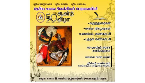 மக்கள் சார்பான முற்போக்குக் கலை இலக்கியப் பாதையில் கடந்த 50 ஆண்டுகளாகப் பயணிக்கின்ற தேசிய கலை இலக்கியப் பேரவையின் 50 ஆவது ஆண்டு விழா வரும் 23.12.2023 சனிக்கிழமை மாலை 3 மணியளவில் வேம்படி வீதியில் யாழ்ப்பாணம் மத்திய கல்லூரி மைதானத்திற்கு அருகில் அமைந்துள்ள றிம்மர் மண்டபத்தில் இடம்பெறவுள்ளது.
