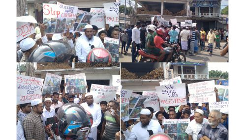 வெள்ளி ஜும்மா தொழுகையினை தொடர்ந்து பாலஸ்தீன மக்களுக்கு ஆதரவு தெரிவித்து இவ்வாறு கவனயீர்ப்பு போராட்டம் முன்னெடுக்கப்பட்டது.
