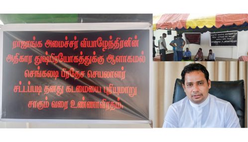 இராஜாங்க அமைச்சர் எஸ் வியாழேந்திரனின் அதிகார துஸ் பிரயோத்துக்கு ஆளாகாமல் செங்கலடி பிரதேச செயலாளர் சட்டப்படி தமது கடமையை புரியுமாறும். அமைச்சரை ஏறாவூர் பற்று பிரதேச அபிவிருத்தி குழு தலைவர் பதவியை பறிக்குமாறு கோரியும் கல் மண் கிறல் ஆகழ்வில் சட்டரீதியாக ஈடுபடுவரும் இருவர் சவப்பெட்டியுடன் மட்டு செங்கலடி பிரதேச செயலகத்திற்கு அருகில் சாகும்வரை உண்ணாவிரதே போரட்டம் ஒன்றை இன்று திங்கட்கிழமை (19) ஆரம்பித்துள்ளனர்.