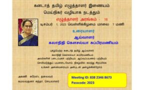 கனடா தமிழ் எழுத்தாளர் இணையம் நடத்தும் மாதாந்த உரையரங்கம் வரிசையில் டிசம்பர் மாதத்தின் எழுத்தாளர் அரங்கம் நிகழ்ச்சியில் கனடாவாழ் ஆய்வாளர் கலாநிதி கௌசல்யா சுப்பிரமணியம் அவர்களின் உரை இடம் பெறும் . இதனைக் கண்டு களிக்க அனைவரும் அன்புடன் அழைக்கப்பெறுகின்றனர்.