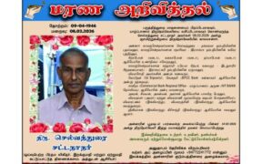 (ஓய்வுபெற்ற பிரதம லிகிதர். இறக்குமதி மற்றும் ஏற்றுமதி கட்டுப்பாட்டுத் திணைக்களம். அத்துடன் ஆசிரியர்) தோற்றம்: 09-04-1946 மறைவு: 08.02.2026 பருத்தித்துறை மாதனையைப் பிறப்பிடமாகவும். யாழ்ப்பாணம் திருநெல்வெலியை வசிப்பிடமாகவும் கொண்டிருந்த செல்வத்துரை சட்டநாதர் அவர்கள் 08.02. 2026 அன்று ஞாயிற்றுக்கிழமை திருநெல்வேலியில் காலமார். அன்னார் காலஞ்சென்றவர்களான செல்வத்துரை -தங்கம்மா ...