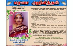 யாழ்ப்பாணத்தைப் பிறப்பிடமாகக் கொண்ட கனகலிங்கம் சந்திராதேவி அவர்கள் 13-04-2026 திங்கட்கிழமை அன்று கனடாவில் இறைவனடி சேர்ந்தார். அன்னார் காலஞ்சென்றவர்களான கந்தையா -பாக்கியம் தம்பதிகளின் அன்பு மகளும், காலஞ்சென்றவர்களான வேலாயுதம் – இராசம்மா தம்பதிகளின் அன்பு மருமகளும், காலஞ்சென்ற கனகலிங்கம் அவர்களின் அன்பு மனைவியும், பிரபாகரன், காலஞ்சென்ற கிருபாகரன், மற்றும் ...